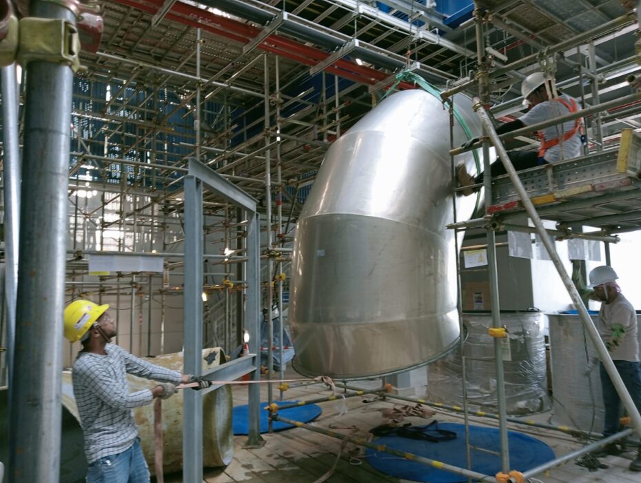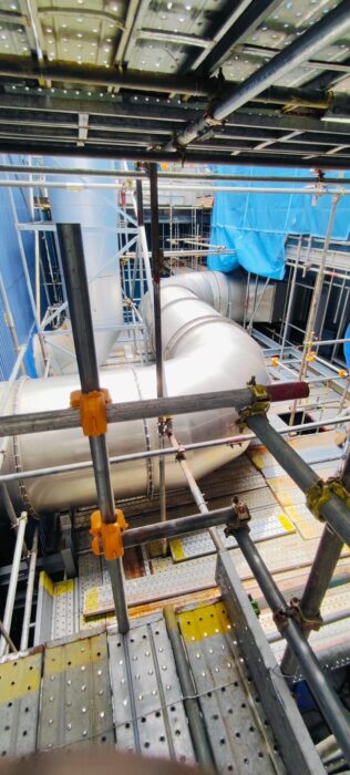 The installation works included coordination of lifting activities, accurate alignment of duct sections, flange connection works, gasket installation, and bolting to ensure proper fit-up and secure connections. Particular care was taken during installation to protect the stainless steel coating and maintain surface integrity, given the corrosive exhaust environment associated with scrubber systems.